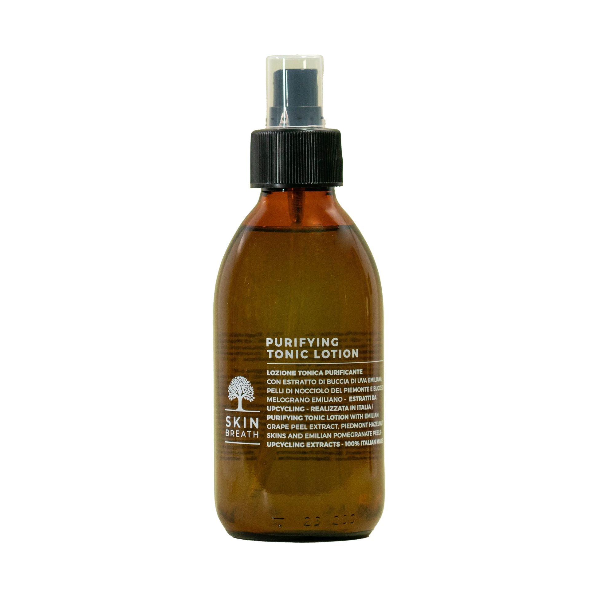 Lozione Tonica per tutti i tipi di pelle. Con estratto di buccia di uva emiliana, pelli di nocciolo del Piemonte e bucce di melograno emiliano.
